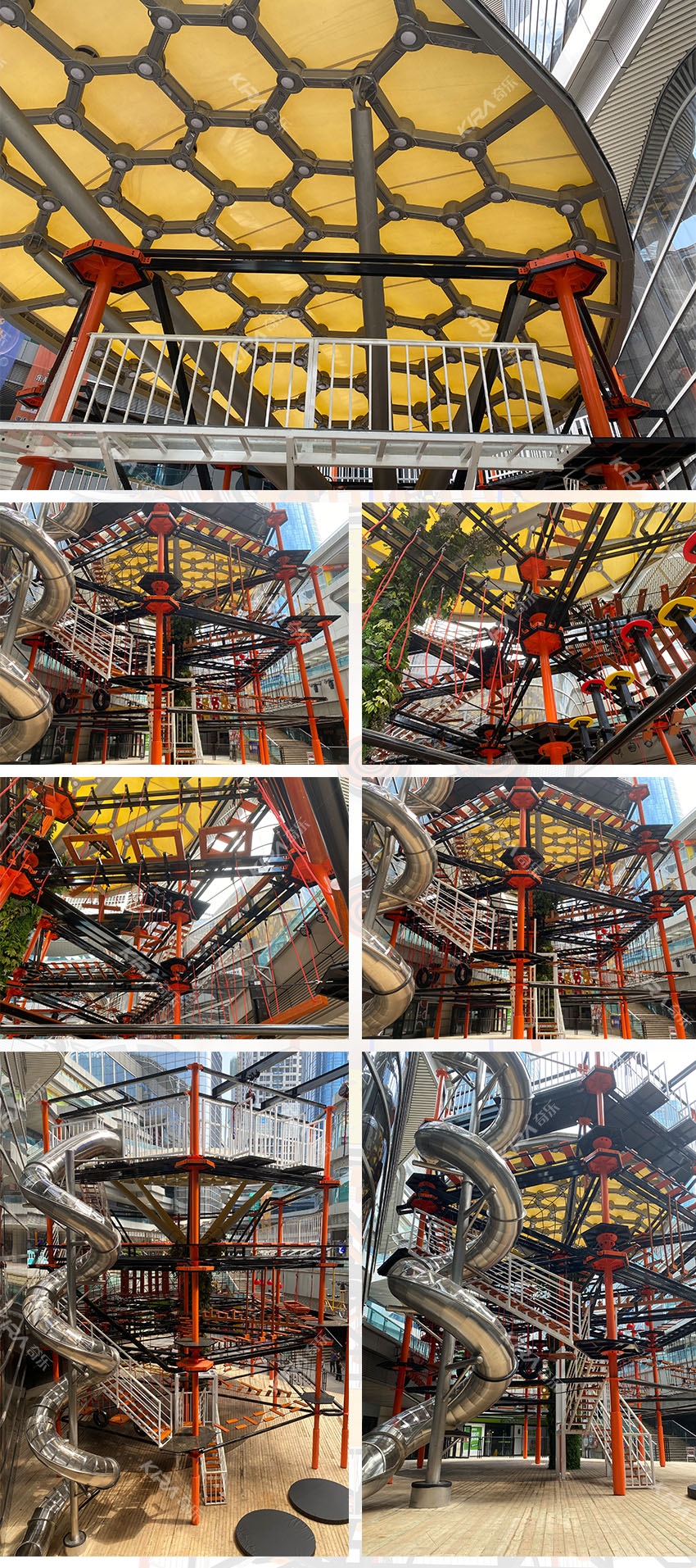 杭州桐廬縣生仙里竹溪探險(xiǎn)塔是一個(gè)匯集戶外娛樂(lè)、攀巖、飛狐等項(xiàng)目于一身的立體娛樂(lè)綜合體,是創(chuàng)新性的景區(qū)標(biāo)志性運(yùn)動(dòng)游樂(lè)項(xiàng)目綜合體,設(shè)備占地面積達(dá)到448㎡,綜合用地面積達(dá)600㎡,單層高達(dá)4.3m,內(nèi)部以晶體結(jié)構(gòu)搭建架空層2-4個(gè)步道層級(jí),打造層超過(guò)650米長(zhǎng)的空中游樂(lè)路線,其中包含91個(gè)運(yùn)動(dòng)項(xiàng)目(包括尖叫滑梯、矩形秋千、低空蹦極、戶外攀巖等4個(gè)),能滿足150個(gè)游客同時(shí)進(jìn)行冒險(xiǎn),被譽(yù)為運(yùn)動(dòng)游樂(lè)之王。