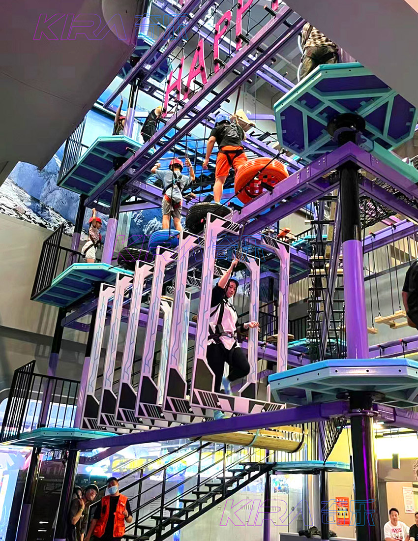設(shè)計了高、中、低三層拓展步道,設(shè)置有懸空橋梁、鉆筒等步道關(guān)卡,游玩者需通過爬、鉆、滑、跳、跨等動作來進(jìn)行探險,可以鍛煉游玩者的勇氣、毅力和身體的協(xié)調(diào)性。