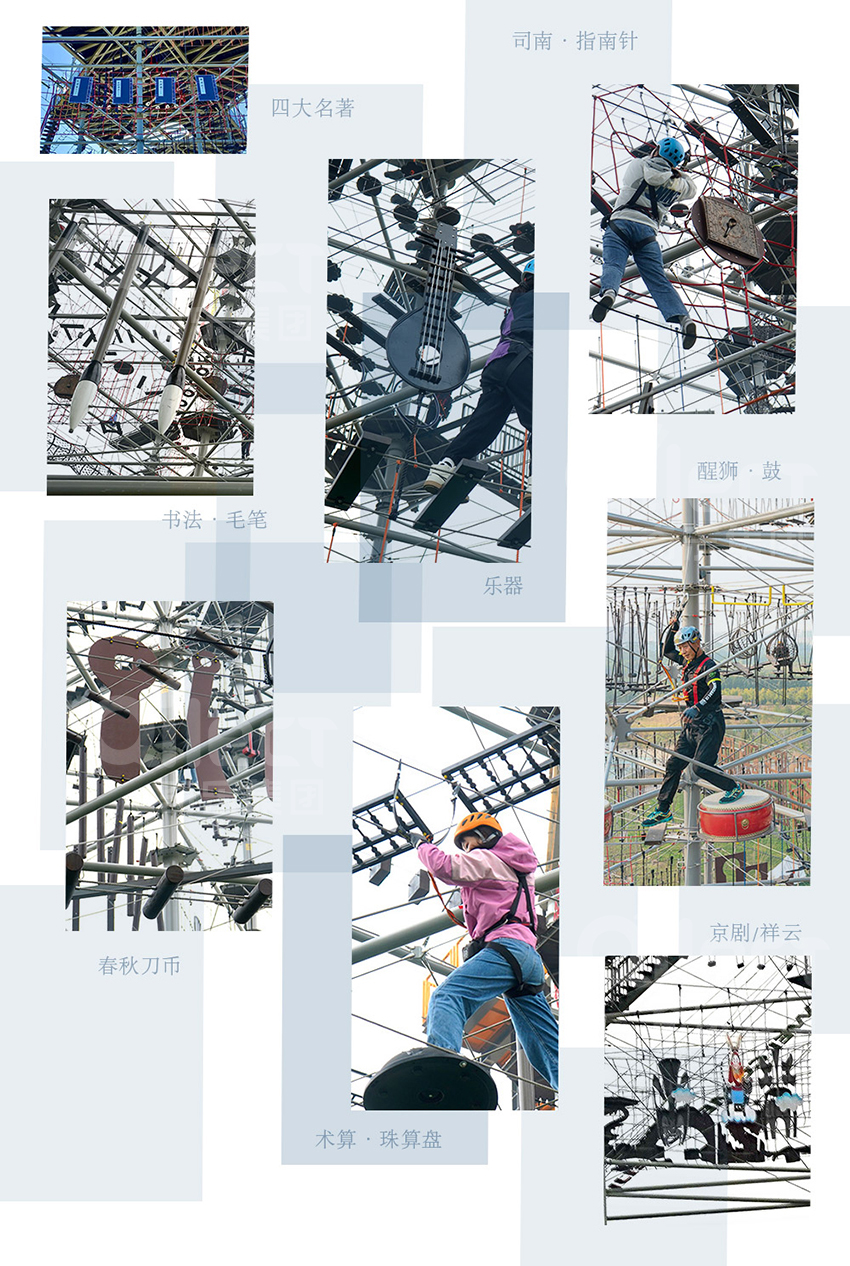 奇樂以游客體驗、文化體驗方面出發(fā),團建社交、極限運動及周末休閑等功能點來創(chuàng)新開發(fā)匯集拓展、探險、滑道、滑索、蹦極、攀巖、爬網(wǎng)、高空秋千等218種不同的運動體驗項目。關(guān)卡式挑戰(zhàn)的設(shè)計,難易分區(qū),每個人都能在這里找到適合自己的挑戰(zhàn)項目。