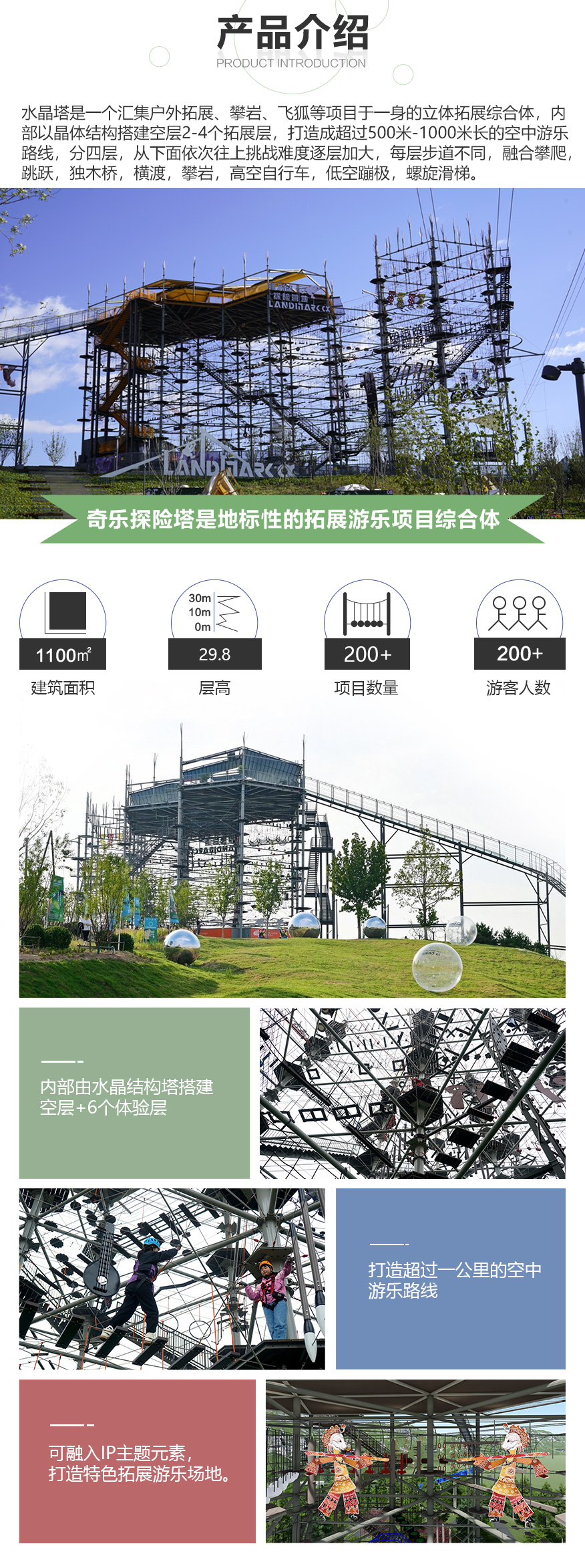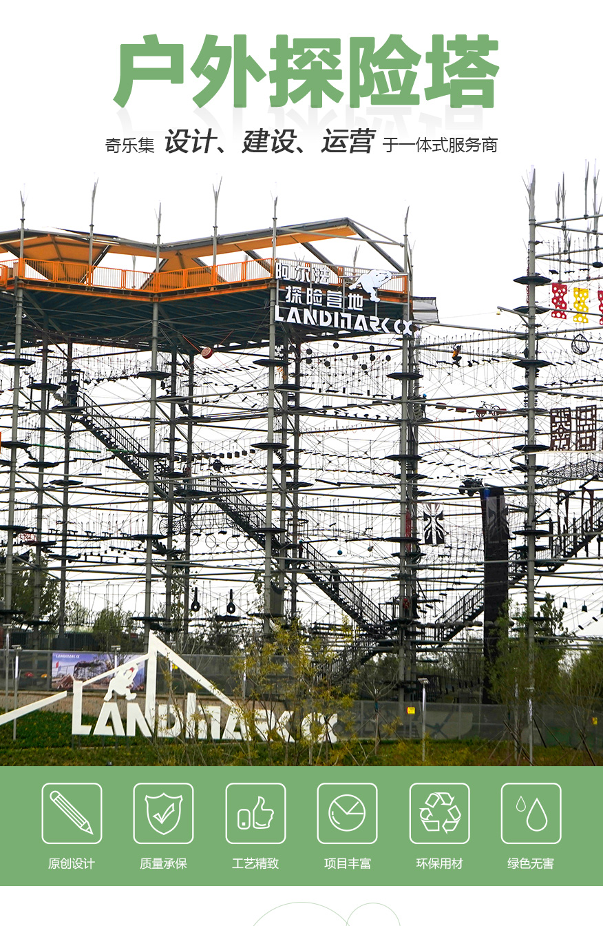 匯集 200 種游樂步道,適合廣大游客 水晶塔集冒險(xiǎn)、運(yùn)動(dòng)、娛樂、挑戰(zhàn)于一體的綜合游樂類項(xiàng)目,通過在塔內(nèi)設(shè)置并搭建各種難易不同、風(fēng)格迴異、超強(qiáng)刺激的步道關(guān)卡,讓游客體驗(yàn)高空墜落與自由滑翔的快感,感受塔內(nèi)項(xiàng)目攀爬穿越的刺激。水晶塔是一個(gè)創(chuàng)新且極具盈利能力的全新休閑旅游項(xiàng)目,適合建在戶外,也可以建在窒內(nèi)。 晶體結(jié)構(gòu),更穩(wěn)固,更安全 水晶塔采用品體結(jié)構(gòu)設(shè)計(jì),每4根立柱為1個(gè)晶體結(jié)構(gòu),可根據(jù)客戶需求自由組合,晶體結(jié)構(gòu)設(shè)計(jì)更大的增加設(shè)備的穩(wěn)定性、利用率,保證客戶場(chǎng)地的實(shí)用率最大化,立柱之間做連桿支撐,根據(jù)結(jié)構(gòu)設(shè)置觀景臺(tái),可達(dá) 80~1000+m?,可作為餐飲,休閑吧,咖啡吧,酒吧等休閑休息區(qū)域,平臺(tái)下方懸空架連接桿支撐,平臺(tái)可同時(shí)承載 30-1000+人。 搭配我司自主研發(fā)生命系統(tǒng),保障安全無(wú)死角自主研發(fā)自鎖式雙掛鉤,相互交替型安全保障永遠(yuǎn)保證有一個(gè)掛鉤自鎖在鋼絲繩上面,保障安全無(wú)死角。
